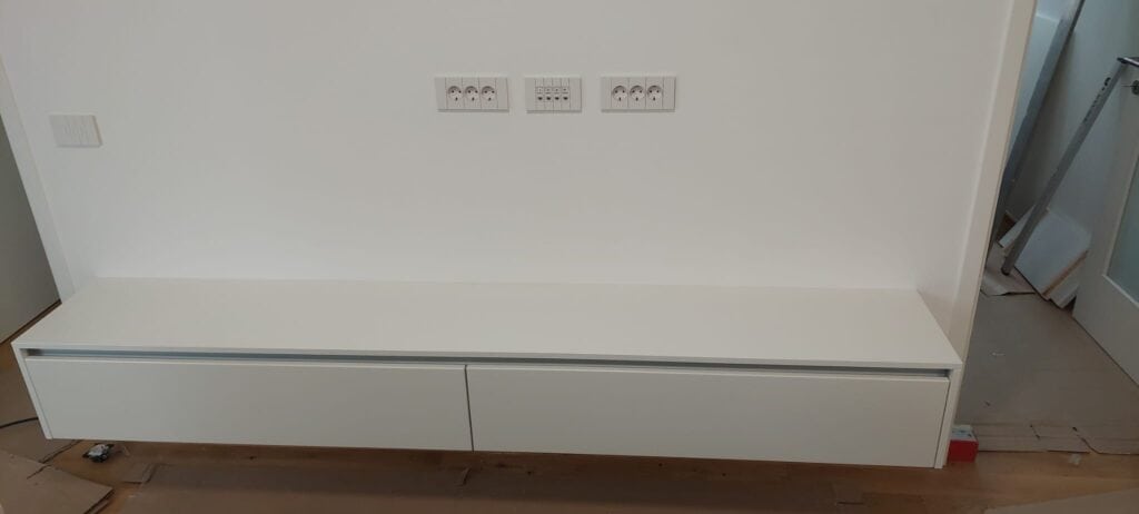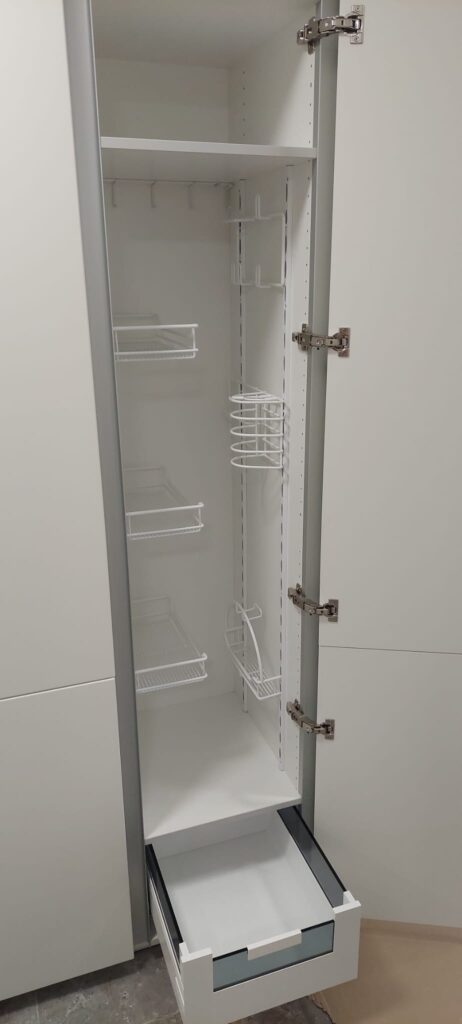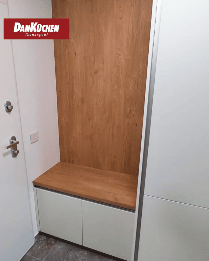 Vkomponirali smo tudi elegantno rešitev za shranjevanje čistil in sesalca ter izdelali dnevni regal ter shranjevalno klop za predsobo.