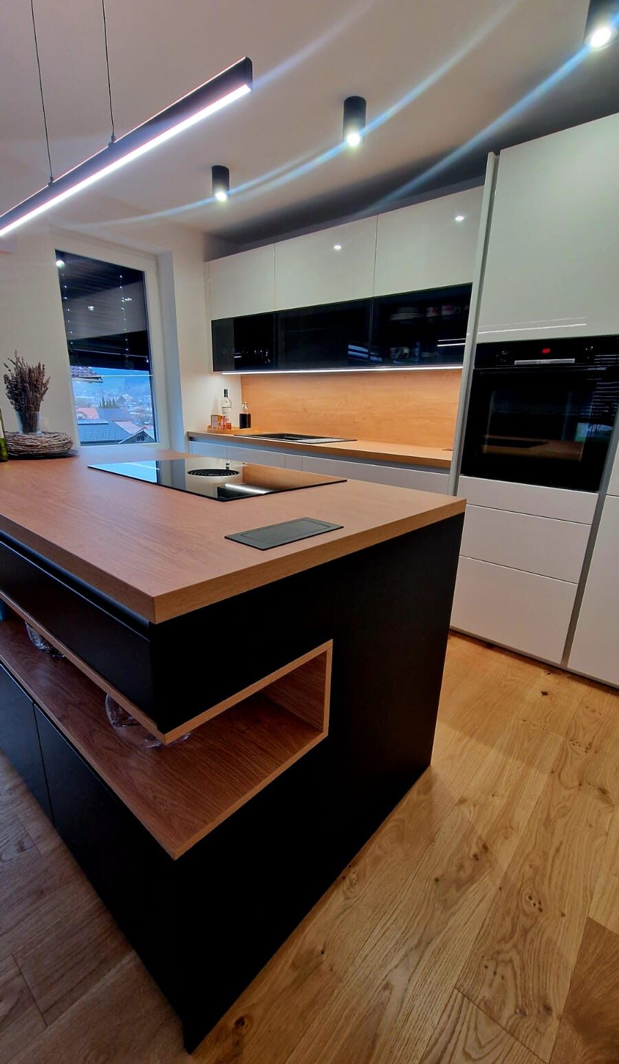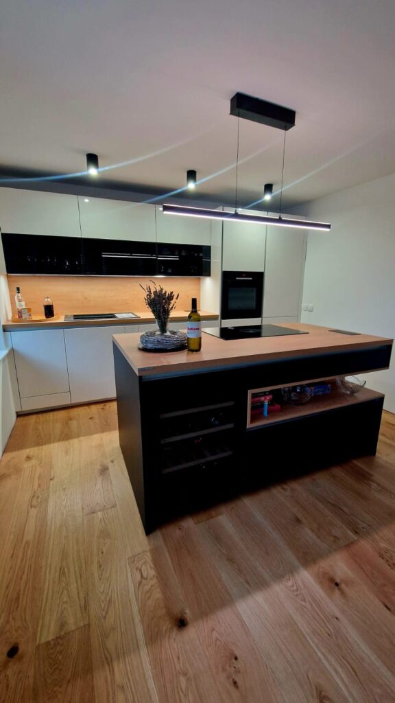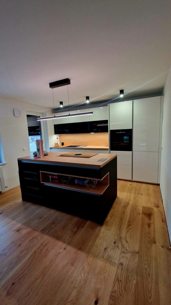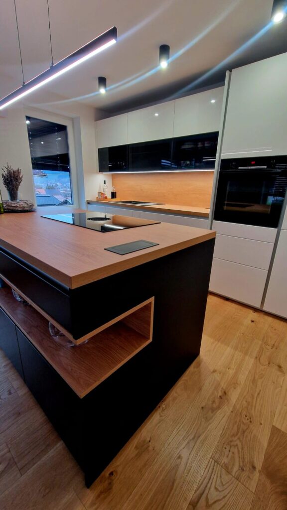 Prostor zaznamujejo čiste linije, premišljena funkcionalna razporeditev ter skrbno izbrani materiali. Vsak element je natančno prilagojen potrebam naročnika – od optimalno zasnovanih shranjevalnih površin do ergonomične postavitve vseh delovnih con.