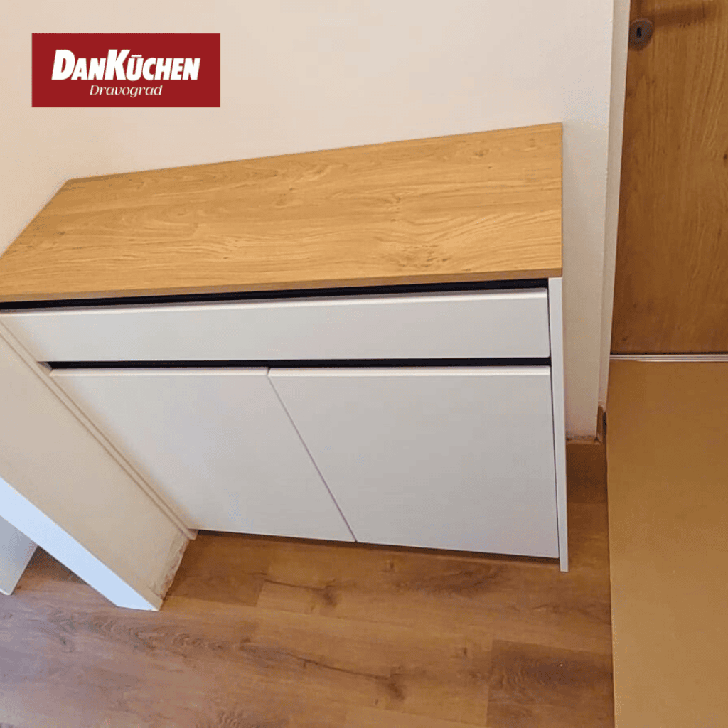 Toplino pa prostoru doda stenska obloga v dekorju hrast nordic, ki mehča kontraste in poskrbi za občutek domačnosti.