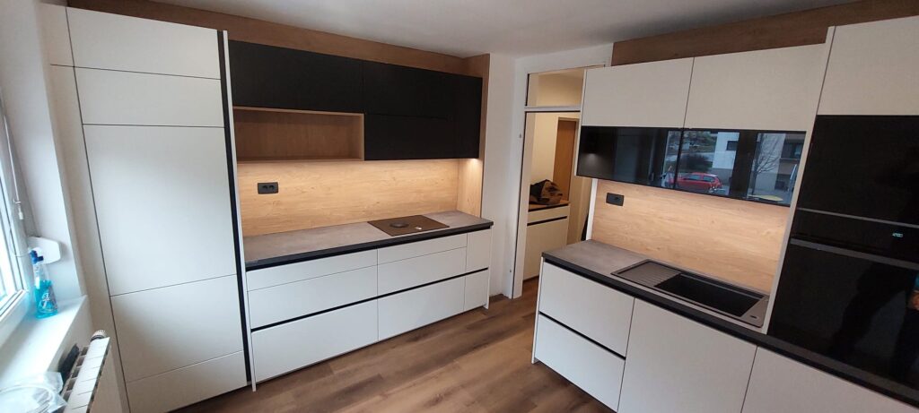 Kuhinja Silbermond v kombinaciji polarno bele supermat lakirane površine in antracit supermat laka ustvarja brezčasen in eleganten videz z modernim pridihom.