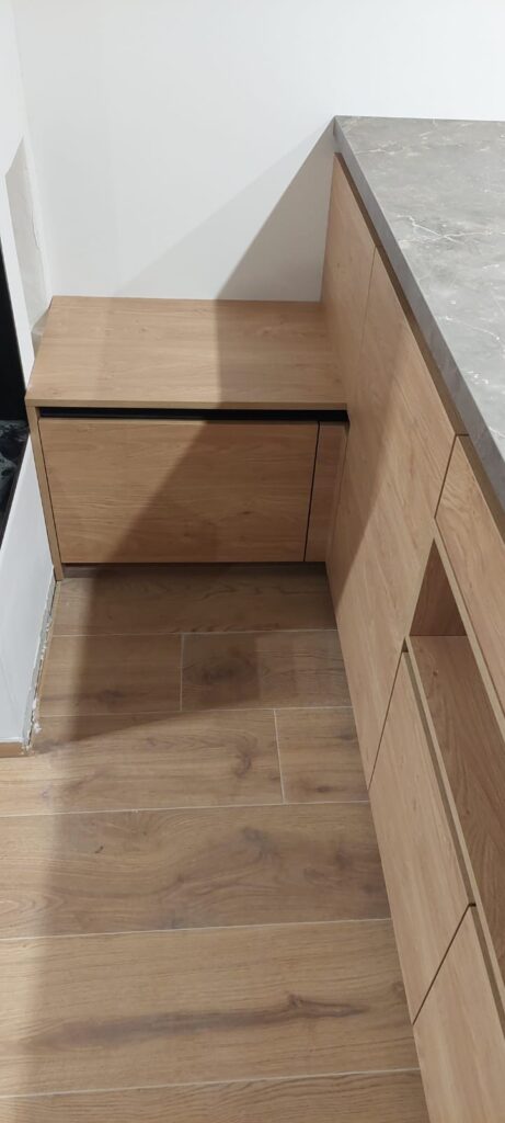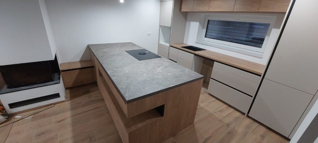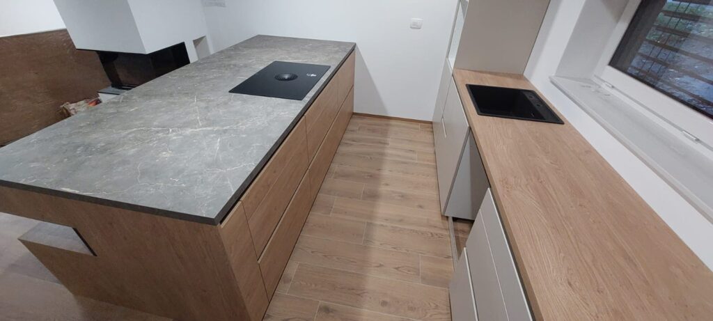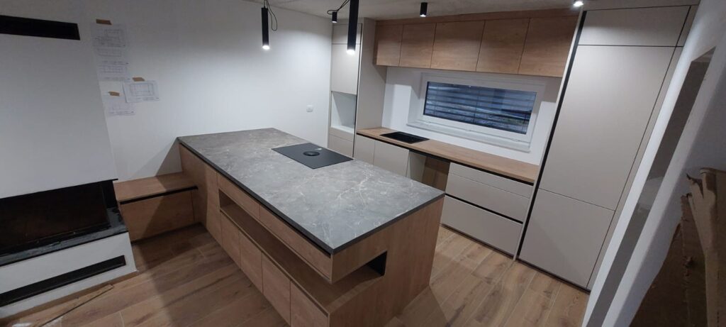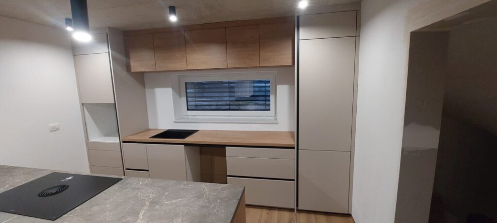 Silbermond▪️ Jasmin supermat lak/ulme mat▪️ Delovna plošča 𝑢𝑙𝑚𝑒 𝑖𝑛 𝑜𝑙𝑖𝑣𝑖𝑛▪️ Bela tehnika: Bora, Franke, Haier