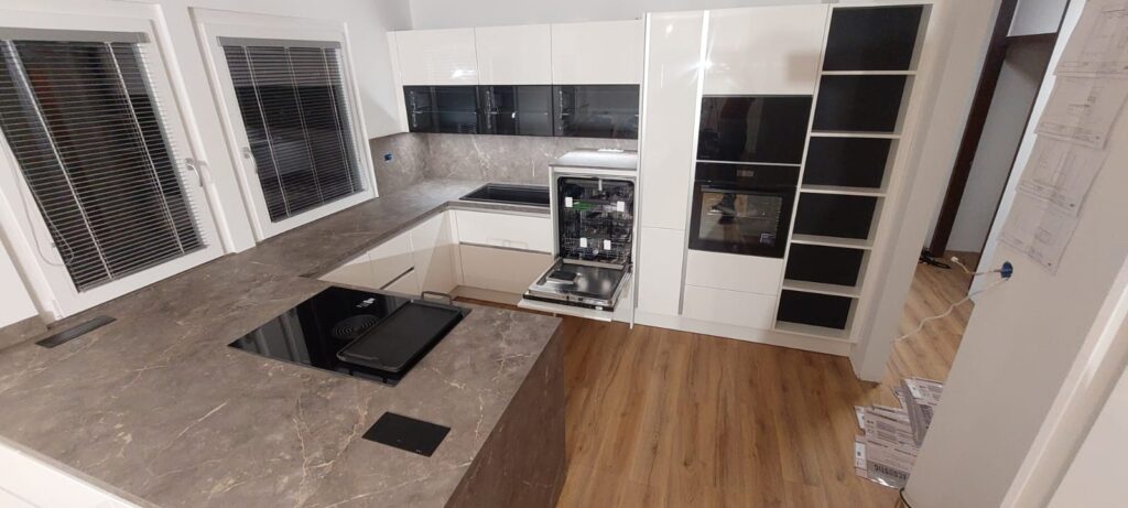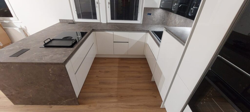 Kuhinja Silbermond v belem laku (visok sijaj), z delovno ploščo 𝑜𝑙𝑖𝑣𝑖𝑛 in izbrano belo tehniko 𝐵𝑜𝑟𝑎, 𝐻𝑖𝑠𝑒𝑛𝑠𝑒, 𝐸𝑙𝑒𝑐𝑡𝑟𝑜𝑙𝑢𝑥 𝑡𝑒𝑟 𝑆𝑖𝑛𝑘 𝑆𝑜𝑙𝑢𝑡𝑖𝑜𝑛.